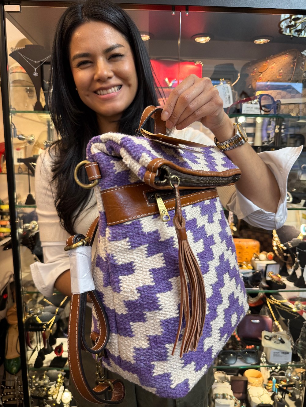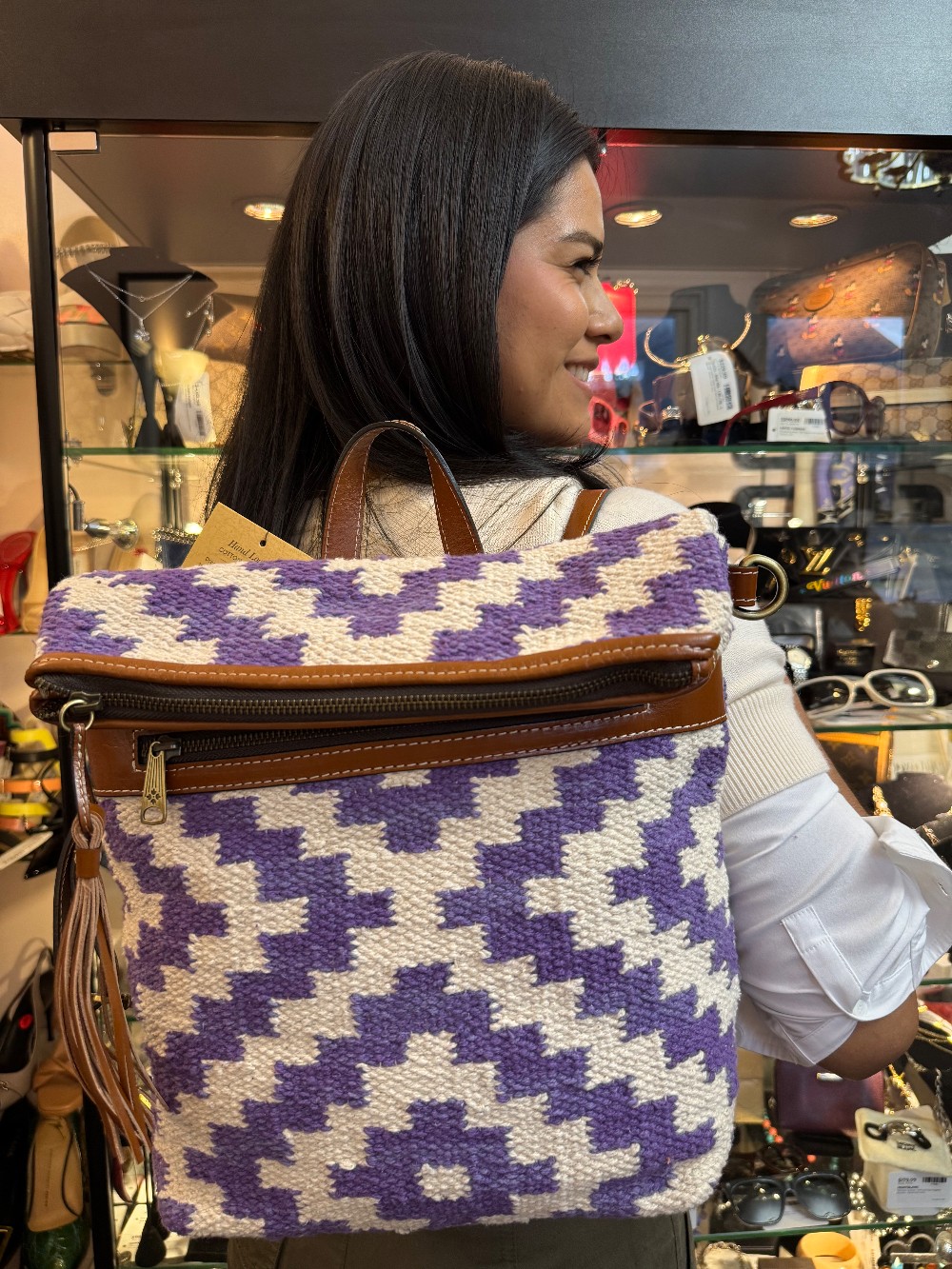 NEW W/ TAGS - Hand Loomed Woven Leather Trimmed Backpack - Purple / Brown / Cream