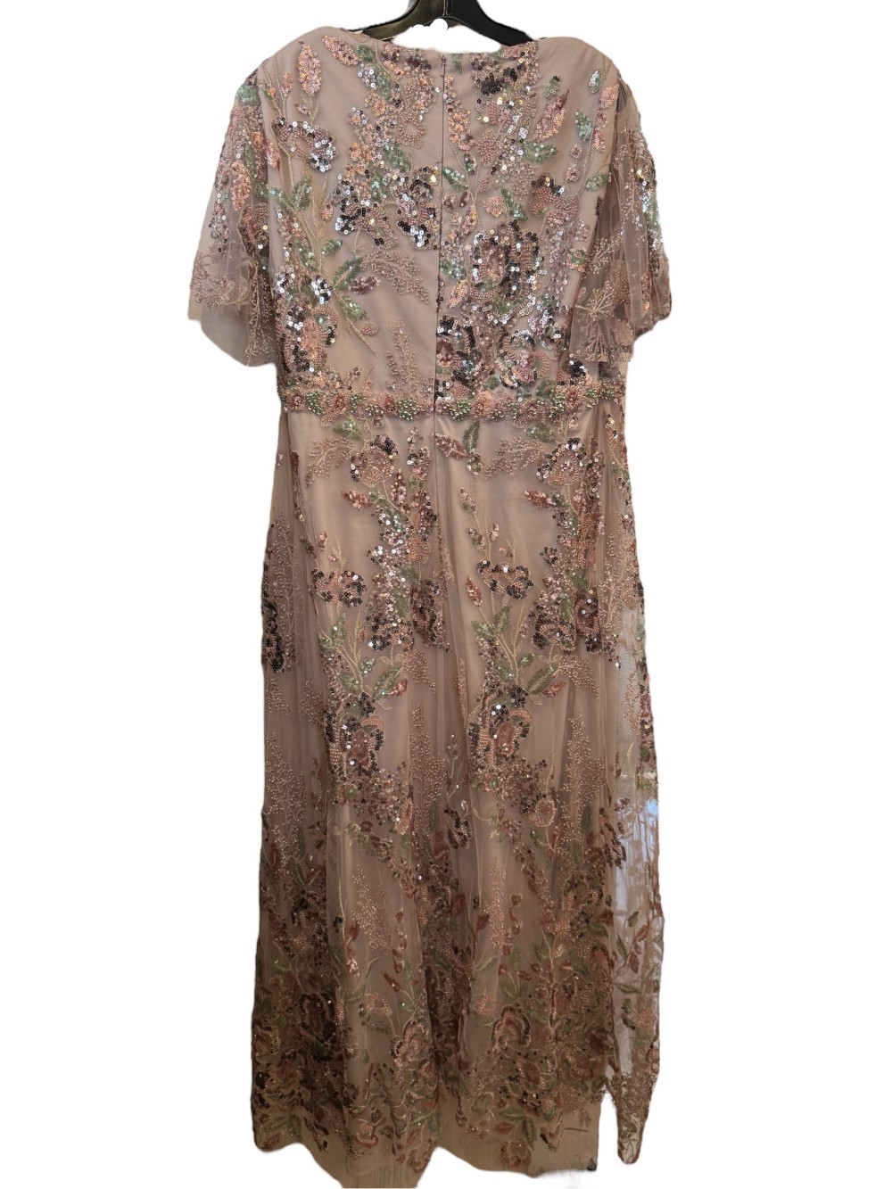 Beaded Floral Sequin Embellished Short Sleeve V Neck Gown - Pink / Green