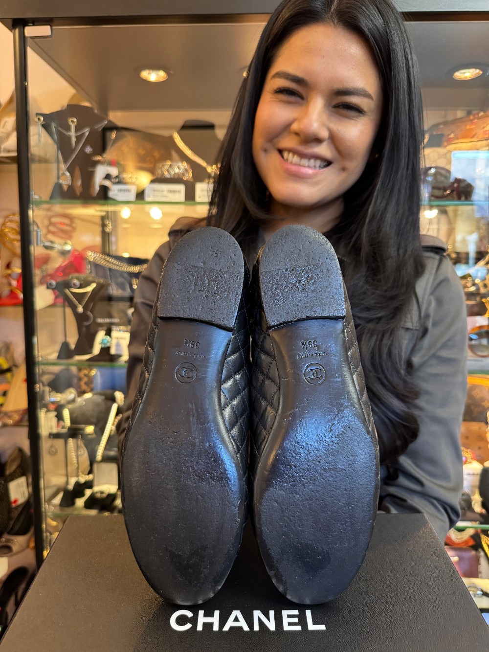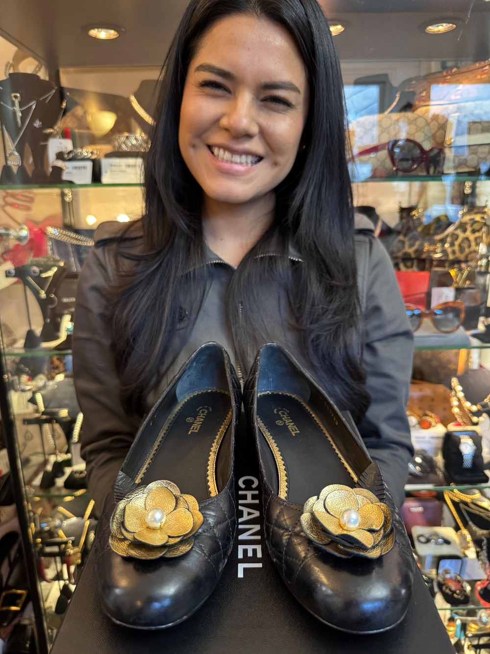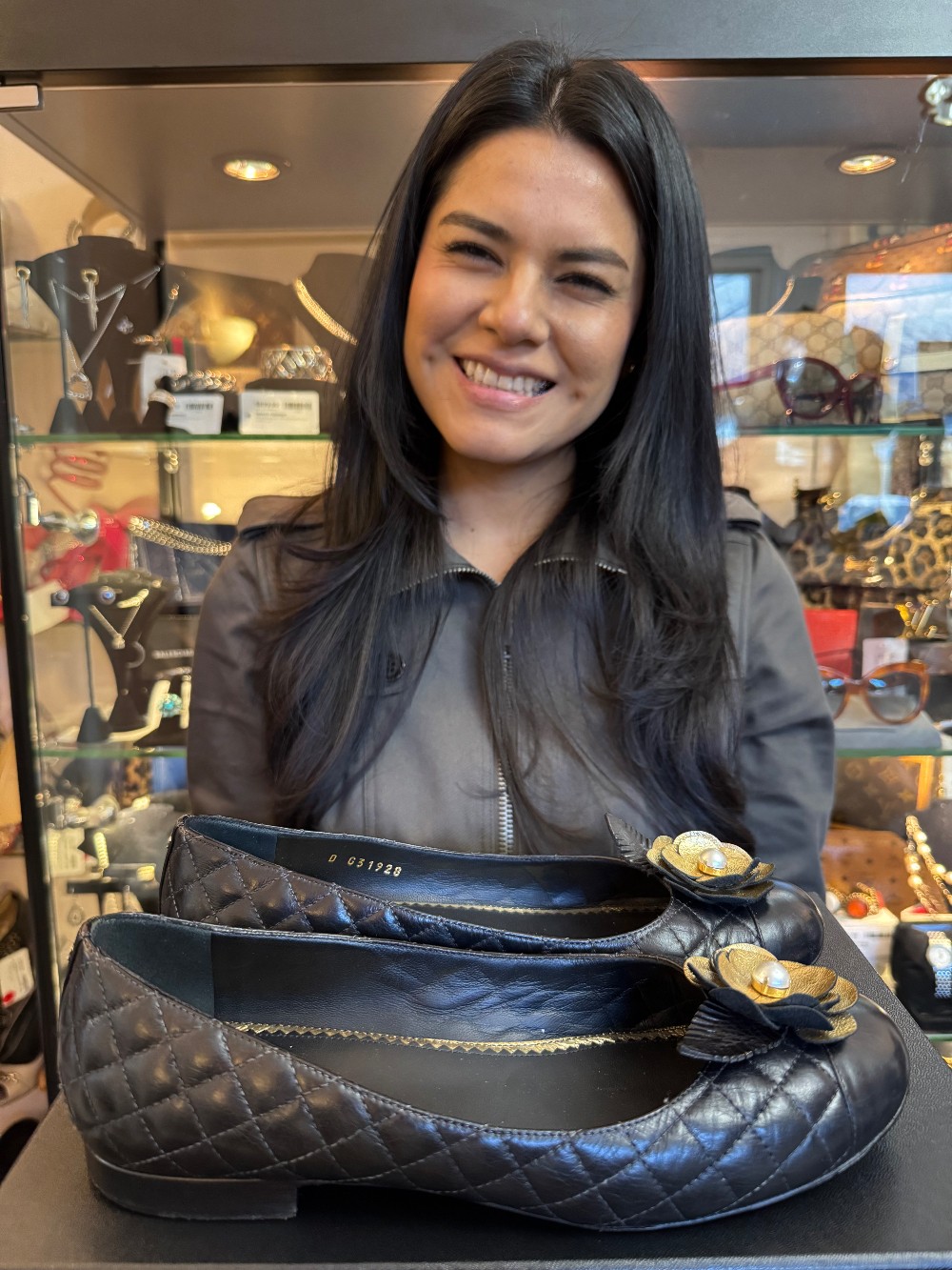 Quilted Calfskin Camelia Flat w/ Flower - Black / Gold Tone - W/ BOX