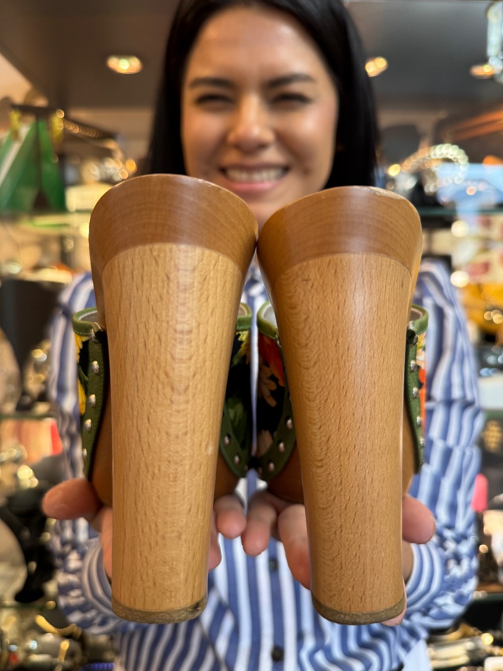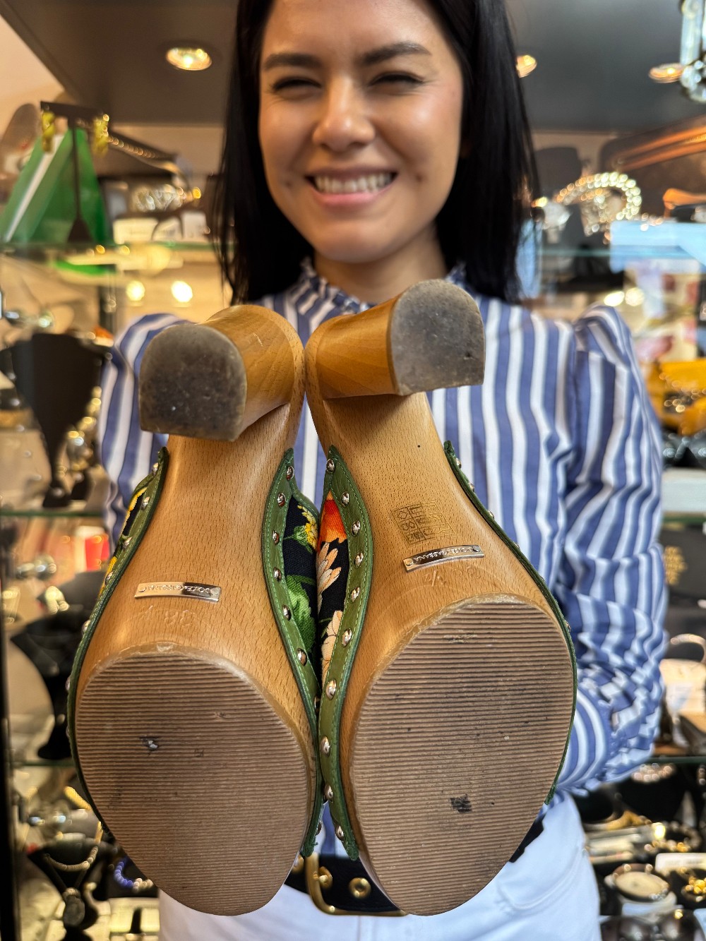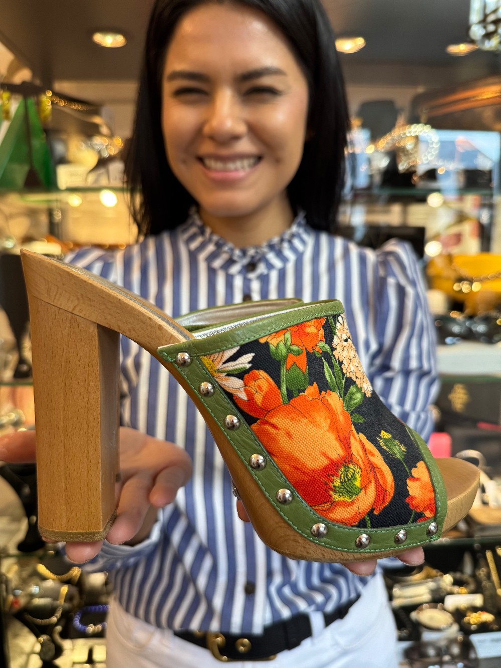Stud Trimmed Floral Canvas Wooden Block Heel Mule - Black/Orange/Yellow/Green