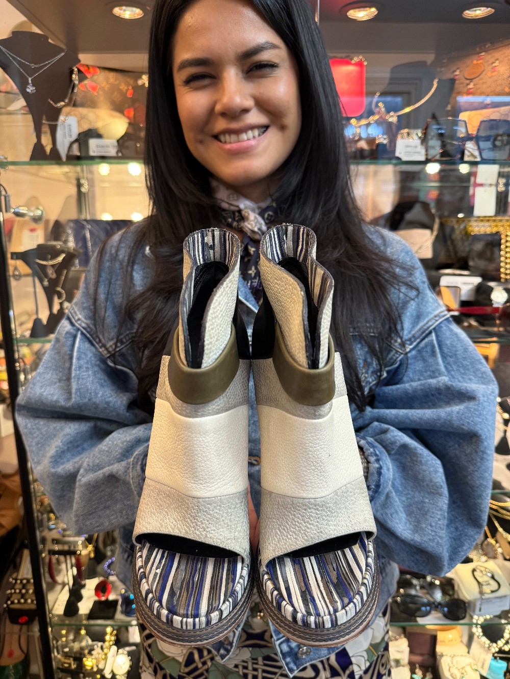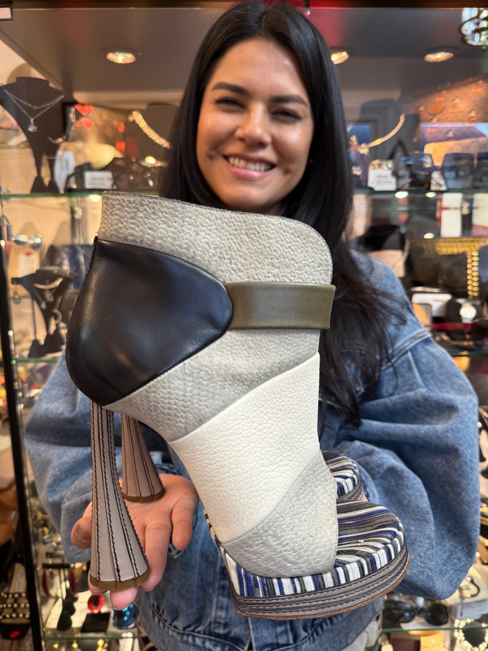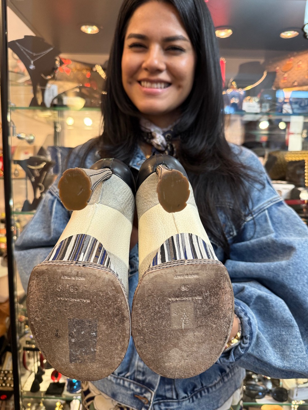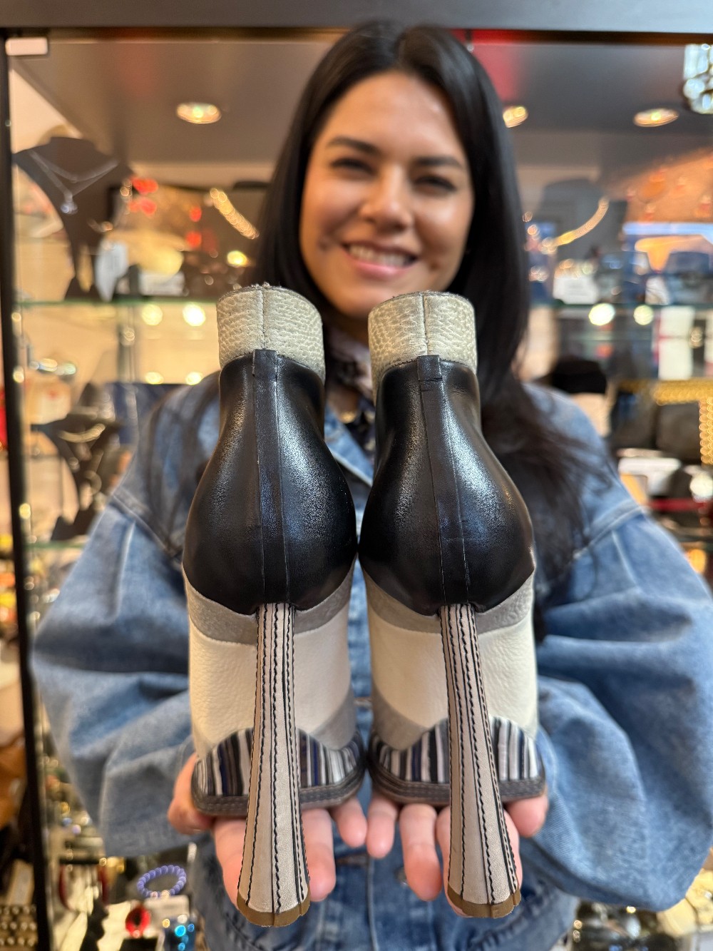 Open Toe / Heeled Color Block Leather Ankle Boot - Grey/Black/Ivory/Olive/Blue