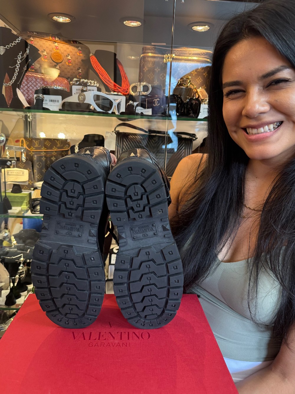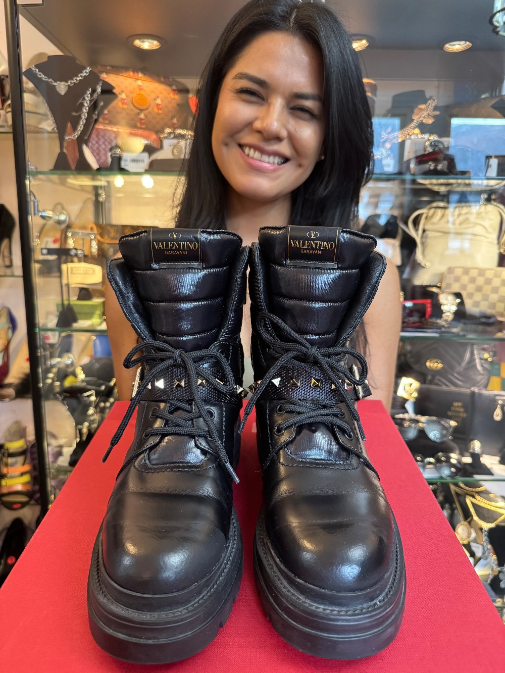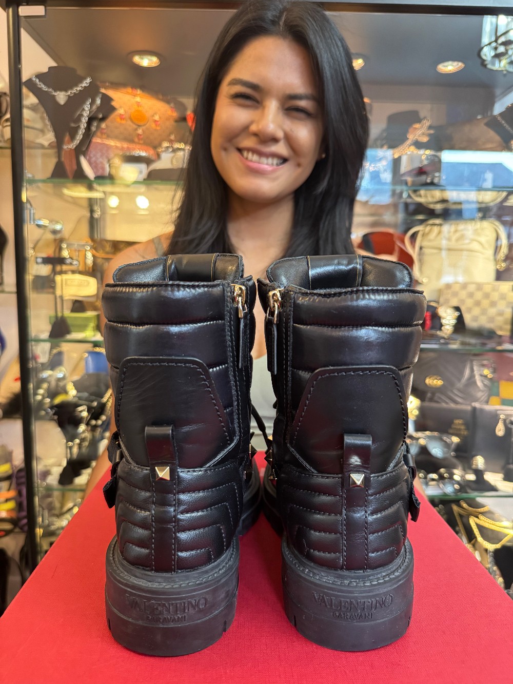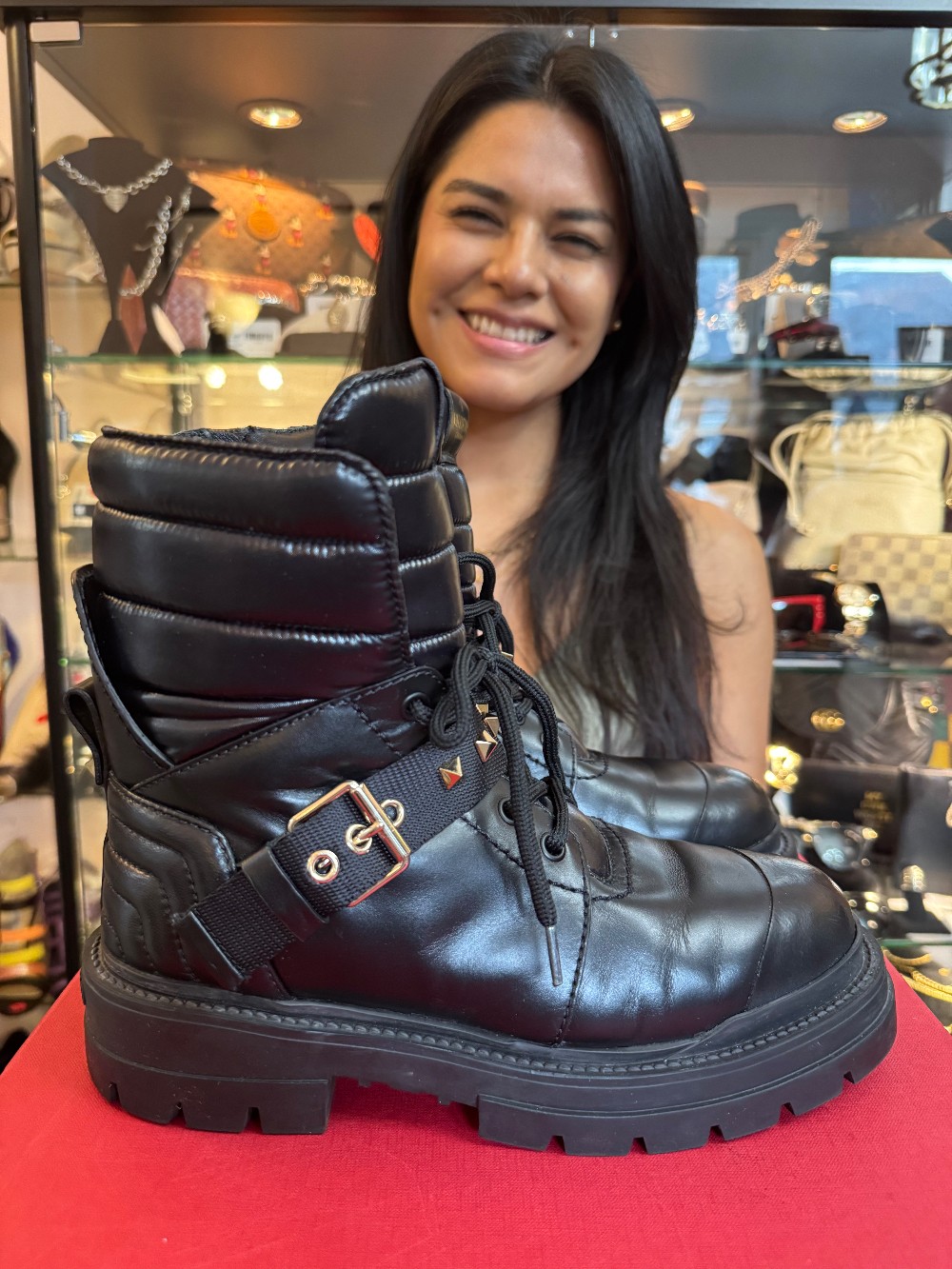 Calfskin & Nylon Quilted Rockstud Combat Boot / Black - W/ BOX