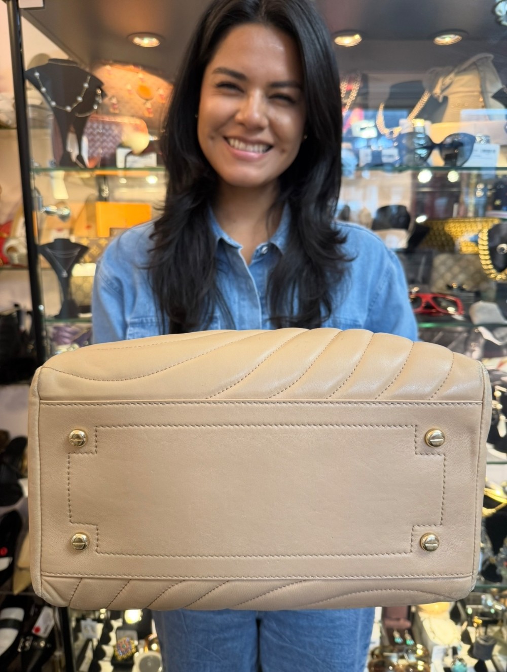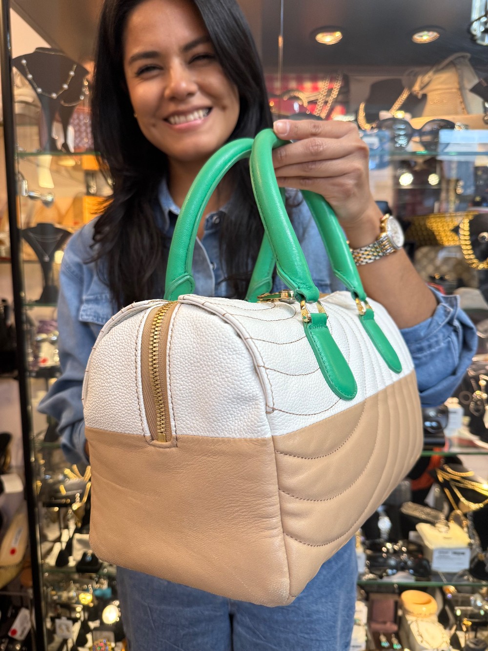 Faux Leather Quilted Colorblock Satchel - Tan/White/Green - BLEMISHES