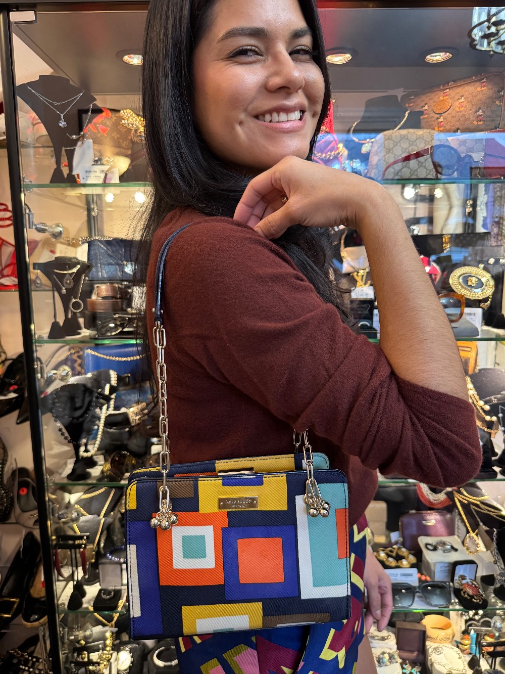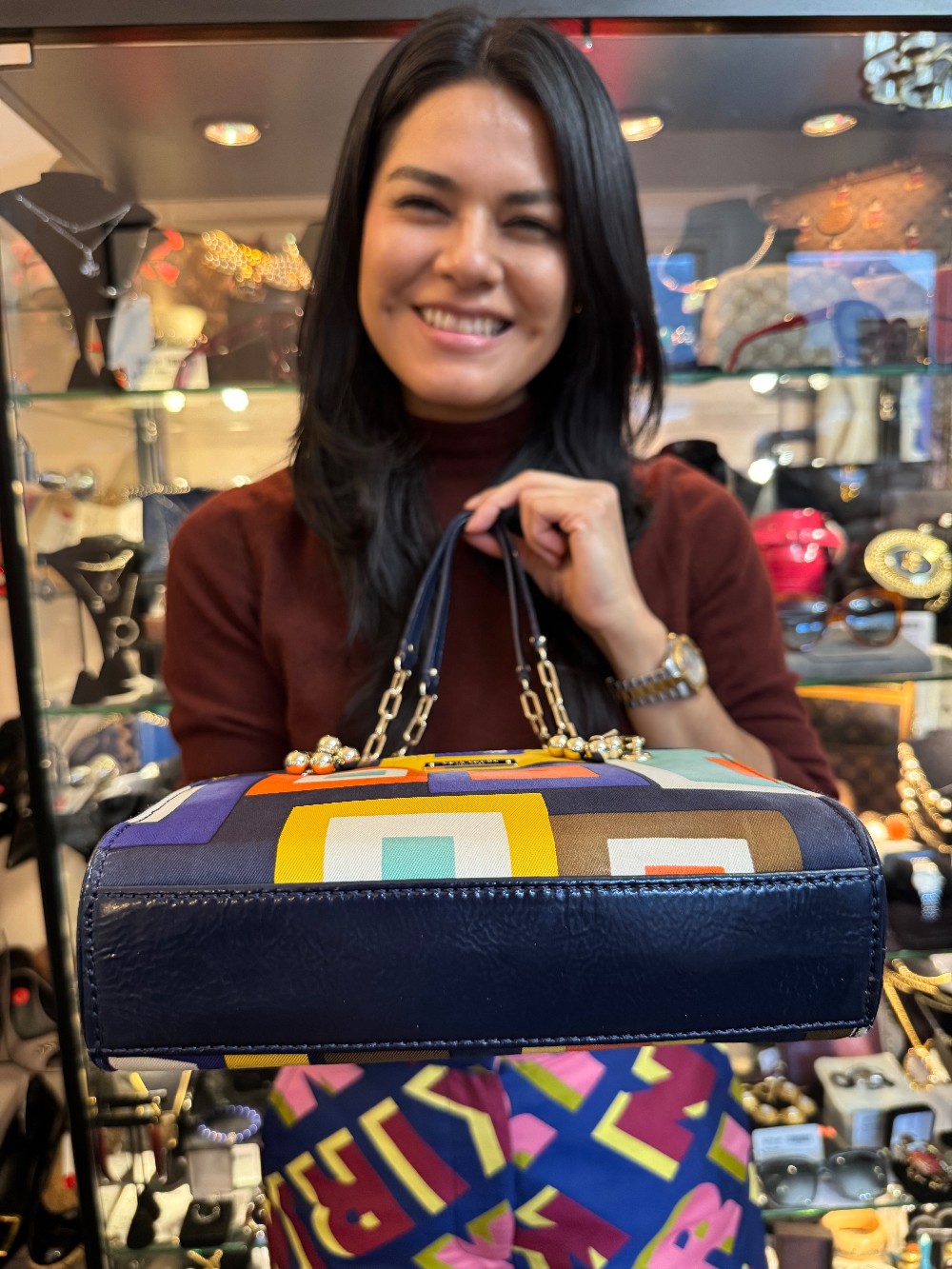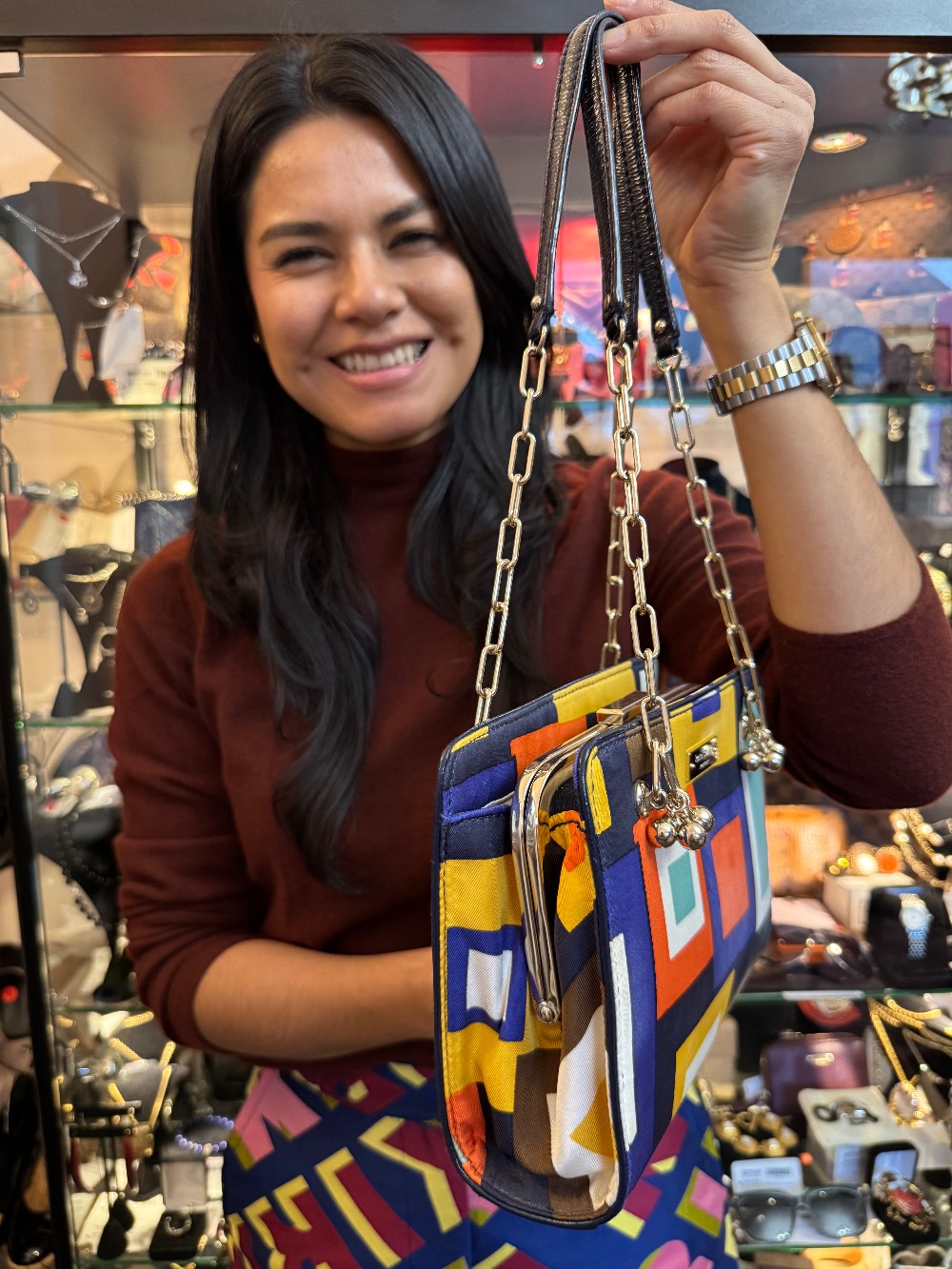 Geometric Print Chain Strap Shoulder Bag - Orange / Blue / Yellow / Black