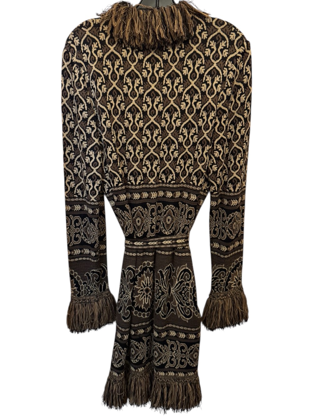 Damask Print Fringe Edged Tie Waist Open Cardigan - Brown / Tan