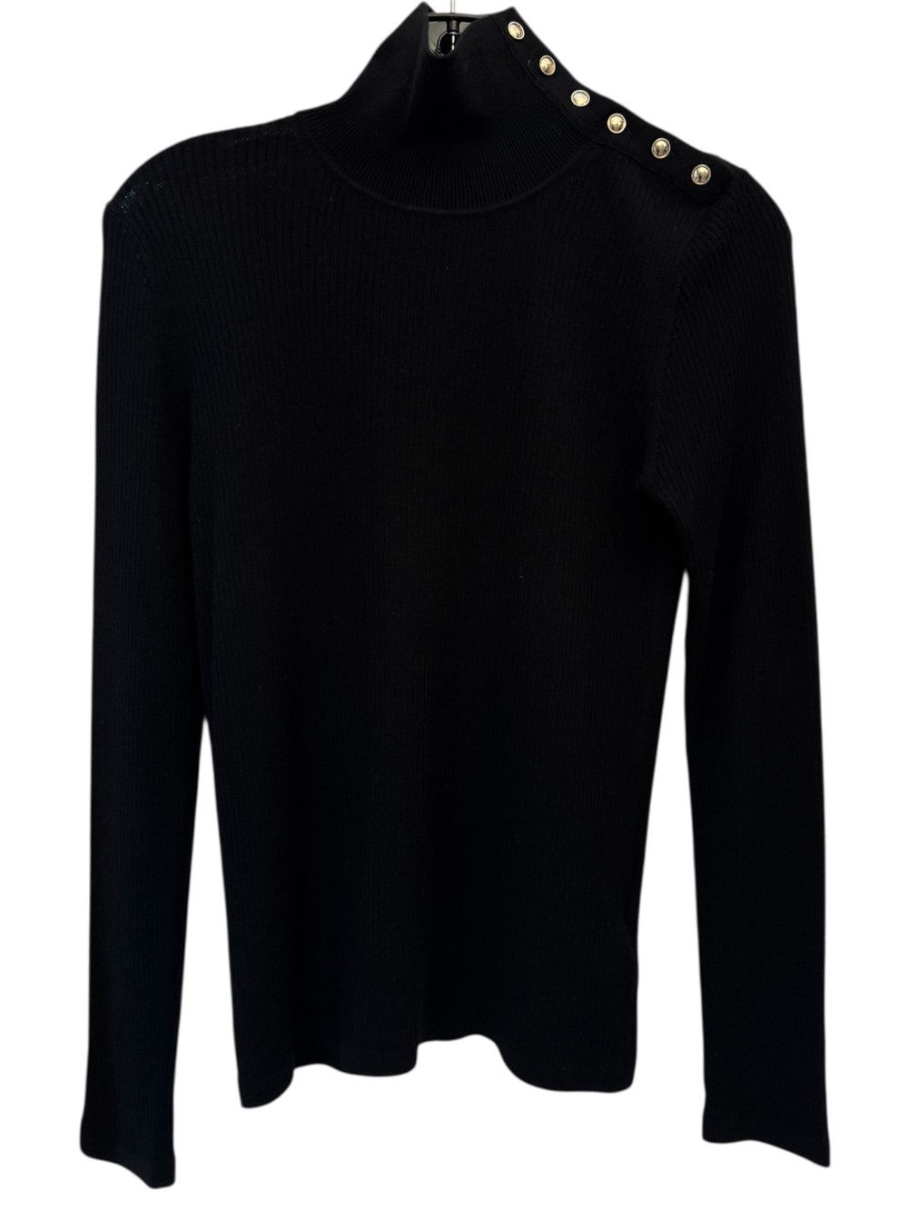 Merino Wool Turtleneck W/ Check Trim Buttoned Accent - Black / Tan