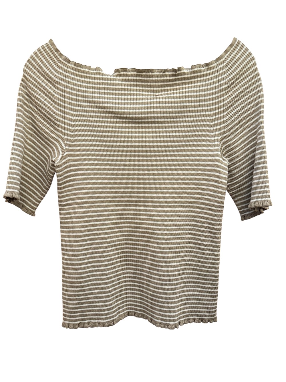 NEW W/ TAGS - Striped Ruffle Edge Off The Shoulder Stretchy Top - Tan / Cream