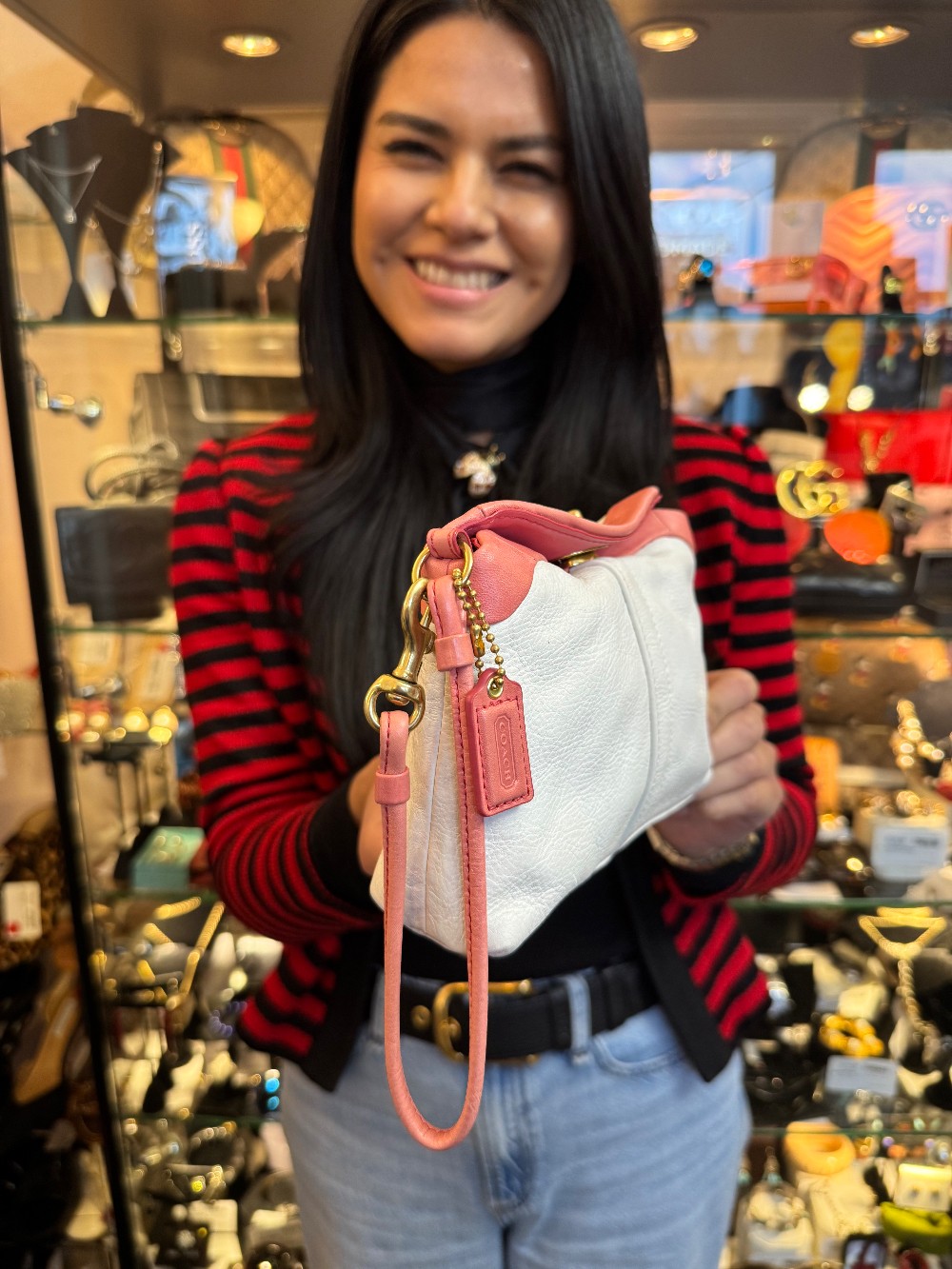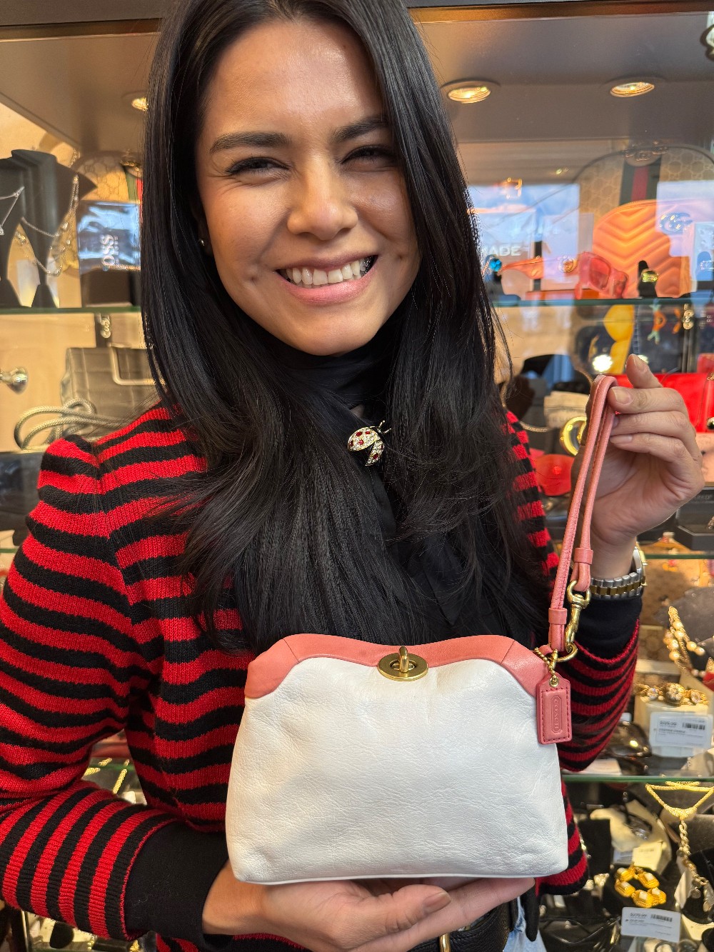 Leather Wristlet W/ Turnkey Latch - Off-White/Pink