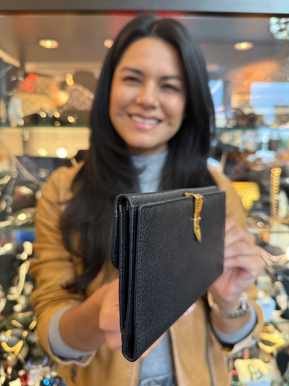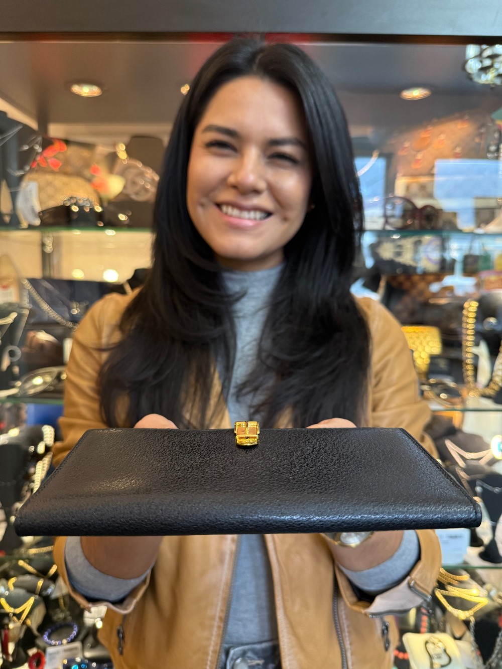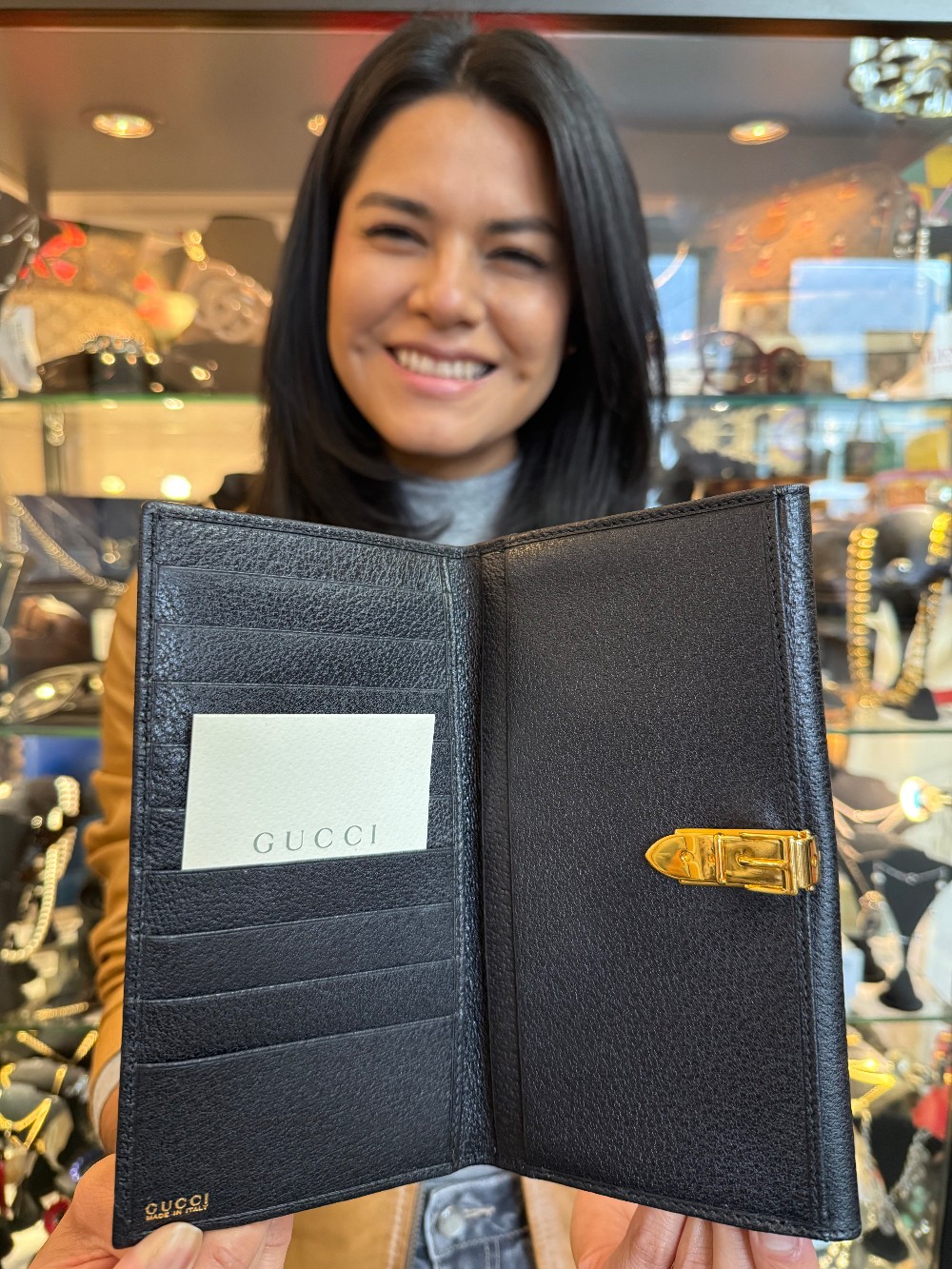 Grained Leather Continental Wallet w/ Buckle Detail - Black / Gold Tone