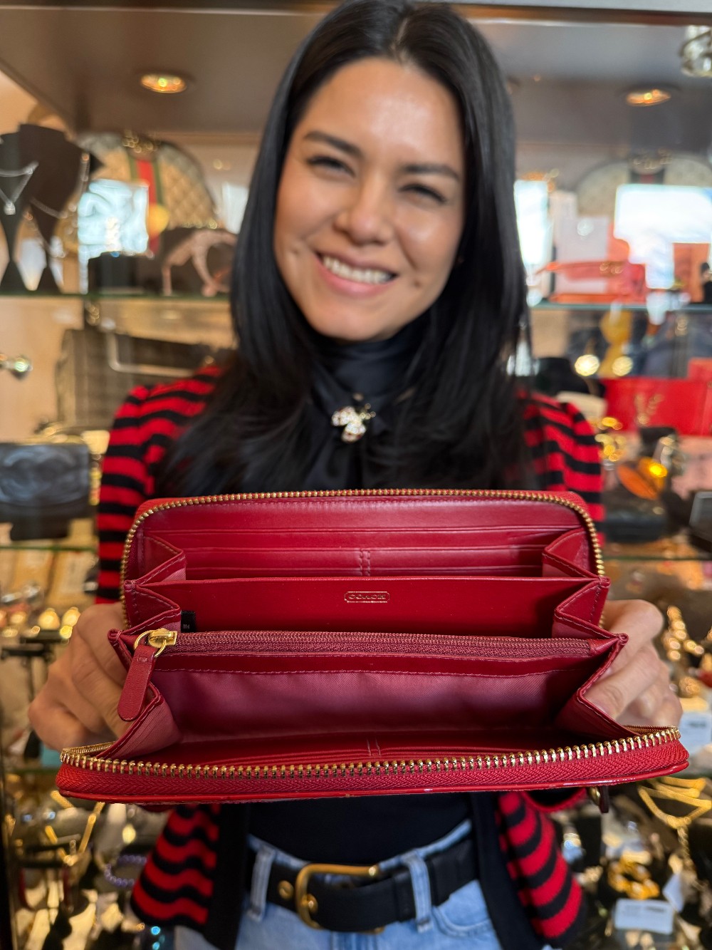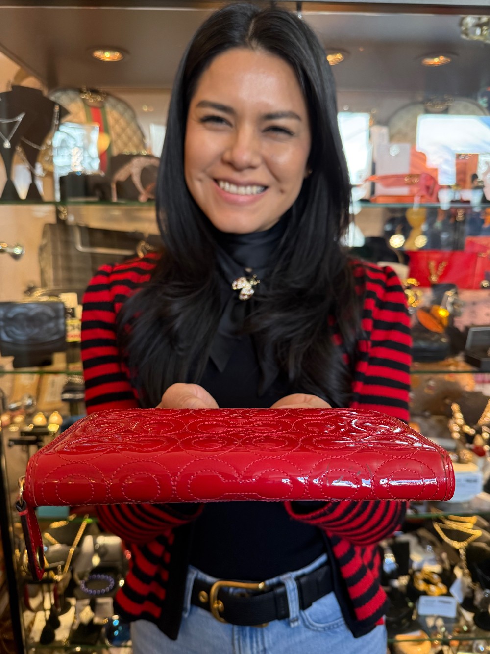 Quilted Logo Patent Leather Zip Around Contiential Wallet - Red